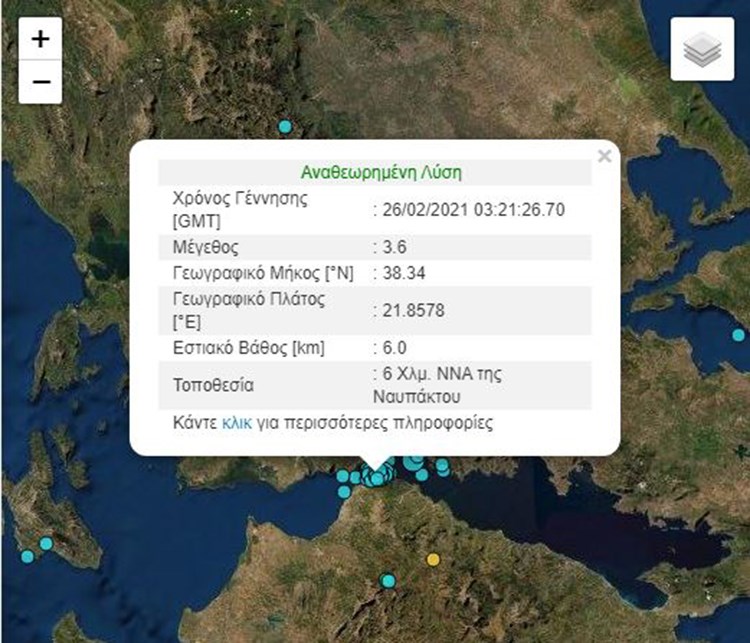 Σεισμική δόνηση 3,6 βαθμών της κλίμακας Ρίχτερ σημειώθηκε στις 05:21:00 ξημερώματα Παρασκευής, στη Ναύπακτο, σύμφωνα με την αναθεωρημένη λύση του Γεωδυναμικού Ινστιτούτου.