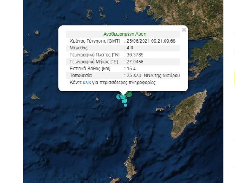 Σεισμός μεγέθους 4 βαθμών της κλίμακας Ρίχτερ σημειώθηκε το μεσημέρι της Παρασκευής, σε θαλάσσιο χώρο ανοιχτά της Νισύρου. Σύμφωνα με το Γεωδυναμικό Ινστιτούτο, η σεισμική δόνηση είχε επίκεντρο 25 χλμ νότια νοτιοδυτικά του νησιού, ενώ το εστιακό βάθος υπολογίζεται στα 15,4 χλμ.