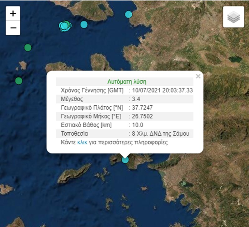 Σεισμική δόνηση σημειώθηκε πριν από λίγο στο νησί της Σάμου. Σύμφωνα με την Αυτόματη Λύση του Γεωδυναμικού Ινστιτούτου Αθηνών ο σεισμός είχε μέγεθος 3,4 Ρίχτερ. Το επίκεντρο εντοπίζεται 8 χιλιόμετρα δυτικά νοτιοδυτικά της Σάμου και το εστιακό βάθος υπολογίζεται στα 10 χιλιόμετρα.