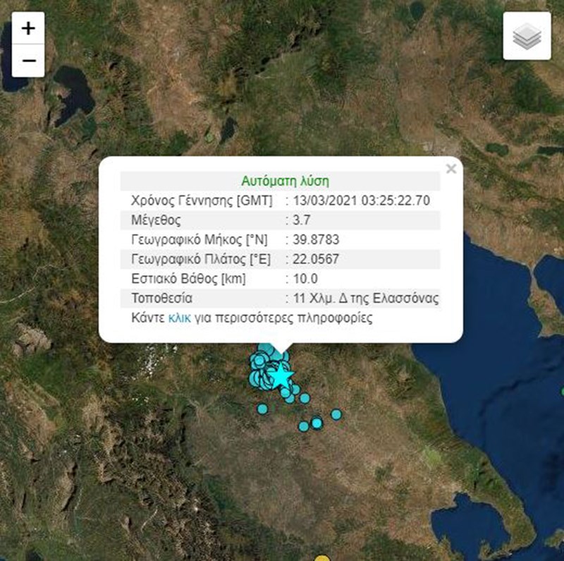 Το εστιακό βάθος της δόνησης υπολογίζεται στα 10 χλμ και το επίκεντρο στα 11 χλμ δυτικά της Ελασσόνας.