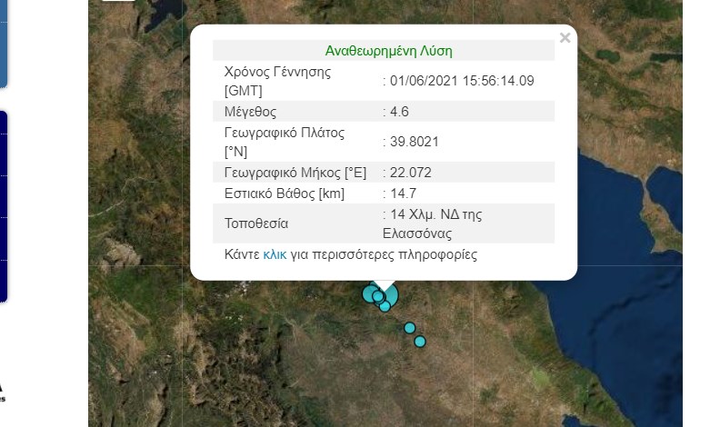 Σεισμός μεγέθους 4,6 βαθμών της κλίμακας Ρίχτερ σημειώθηκε κοντά στην Ελασσόνα. Σύμφωνα με το Γεωδυναμικό Ινστιτούτο, το επίκεντρο του σεισμού ήταν 14 χλμ νοτιοδυτικά της Ελασσόνας, ενώ το εστιακό βάθος υπολογίζεται σε 14,7 χλμ.