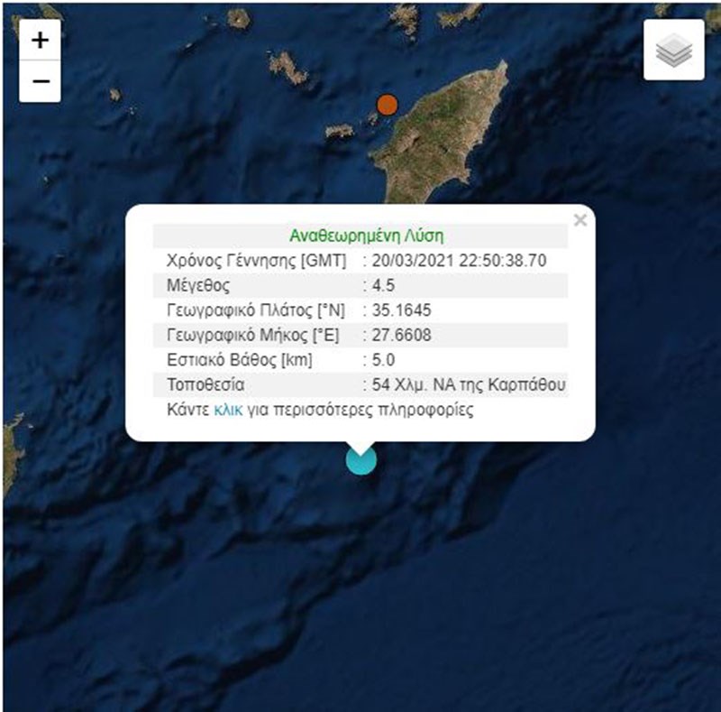 Σεισμός μεγέθους 4,5 βαθμών της κλίμακας Ρίχτερ έγινε στις 00.50 στην Κάρπαθο. Σύμφωνα με το Γεωδυναμικό Ινστιτούτο, το επίκεντρο του ήταν στη θαλάσσια περιοχή 54 χιλιόμετρα νοτιοανατολικά του νησιού και το εστιακό βάθος του ήταν 5 χιλιόμετρα. Ακολούθησε σεισμός 3,9 Ρίχτερ στην ίδια περιοχή.