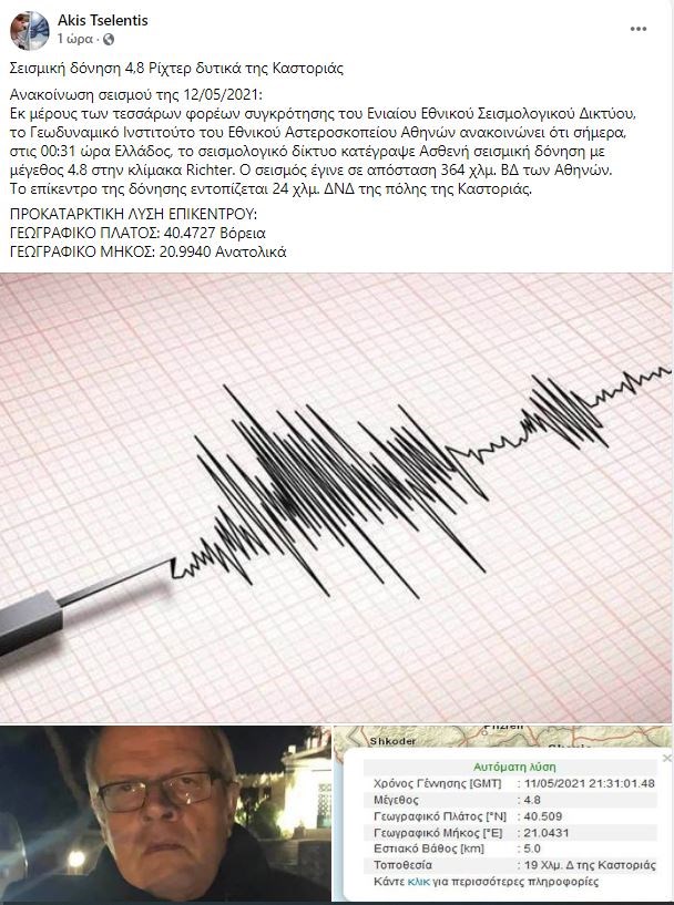 Ανάρτηση για τον σεισμό στην Καστοριά έκανε στον λογαριασμό του στο facebook ο διευθυντής του Γεωδυναμικού Ινστιτούτου του Εθνικού Αστεροσκοπείου Αθηνών Ακης Τσελέντης: