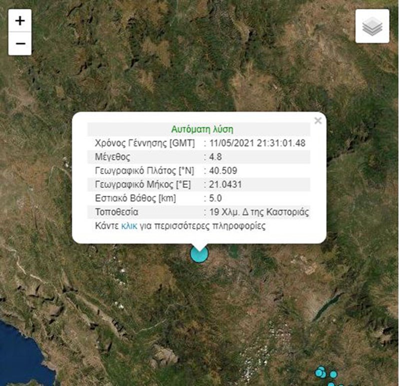 Σεισμός μεγέθους 4,8 βαθμών της κλίμακας Ρίχτερ σημειώθηκε στις 00:31 στην Καστοριά. Σύμφωνα με την αυτόματη λύση του Γεωδυναμικού Ινστιτούτου, το επίκεντρο της σεισμικής δόνησης εντοπίζεται 19 χλμ δυτικά της Καστοριάς. Ο σεισμός είχε εστιακό βάθος τα 5 χλμ.