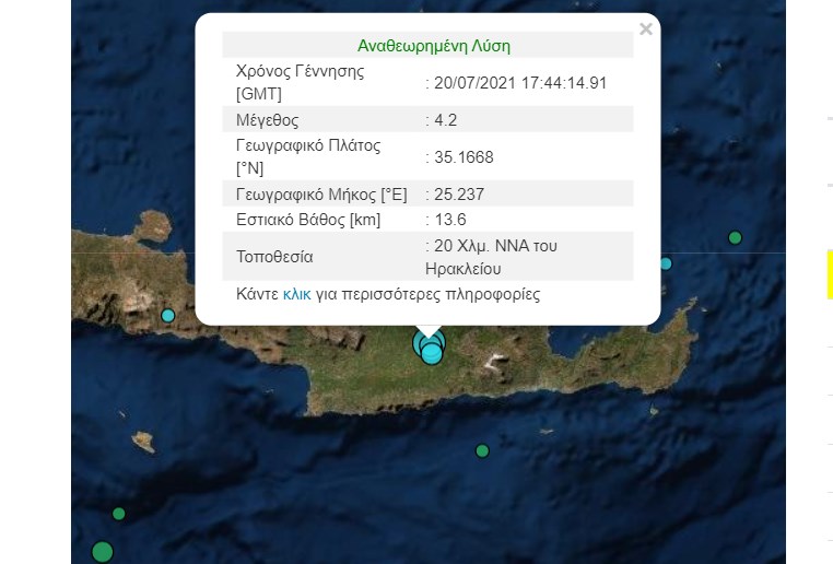 Νέος σεισμός που έγινε ιδιαίτερα αισθητός στο Ηράκλειο, σημειώθηκε πριν από λίγο στην Κρήτη. Σύμφωνα με το Γεωδυναμικό Ινστιτούτο, ο σεισμός ήταν μεγέθους 4,2 βαθμών της κλίμακας Ρίχτερ, με επίκεντρο 20 χλμ νότια νοτιοανατολικά του Ηρακλείου. Το εστιακό βάθος υπολογίζεται σε 13,6 χλμ.