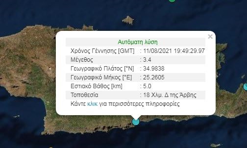 Σεισμός σημειώθηκε πριν από λίγο στην Κρήτη. Σύμφωνα με την Αυτόματη Λύση του Γεωδυναμικού Ινστιτούτου Αθηνών, η σεισμική δόνηση ήταν μεγέθους 3,4 βαθμών της κλίμακας Ρίχτερ.