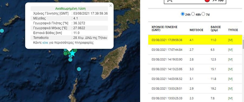 Νέος σεισμός σημειώθηκε πριν από λίγο στην Τήλο. Σύμφωνα με την αυτόματη αναθεωρημένη λύση του Γεωδυναμικού Ινστιτούτου του Αστεροσκοπείου Αθηνών, ήταν μεγέθους 4,1 ρίχτερ σε εστιακό βάθος 11 χλμ. Όσο για το επίκεντρο του εντοπίζεται στα 28 χιλιόμετρα δυτικά νοτιοδυτικά του νησιού.