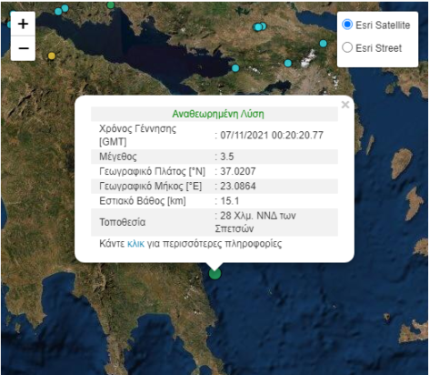 Σεισμός μεγέθους 3,5 βαθμών της κλίμακας Ρίχτερ σημειώθηκε κοντά στις Σπέτσες, με επίκεντρο τον θαλάσσιο χώρο 28 χλμ. νότια νοτιοδυτικά των Σπετσών.