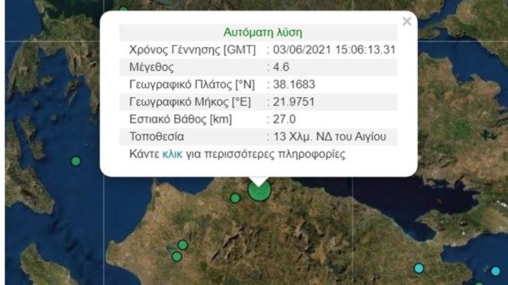 Σεισμική δόνηση σημειώθηκε πριν από λίγο στην περιοχή μεταξύ Αιγίου και Καλαβρύτων . Σύμφωνα με την Αυτόματη Λύση του Γεωδυναμικού Ινστιτούτου Αθηνών ο σεισμός είχε μέγεθος 4,6 Ρίχτερ, με το επίκεντρο να εντοπίζεται 13 χιλιόμετρα νοτιοδυτικά του Αιγίου και το εστιακό βάθος να υπολογίζεται στα 27 χιλιόμετρα.