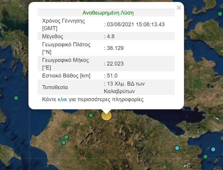 Σύμφωνα με την αναθεωρημένη λύση του Γεωδυναμικού Ινστιτούτου Αθηνών ο σεισμός είχε μέγεθος 4,8 Ρίχτερ. Το επίκεντρο εντοπίζεται 13 χιλιόμετρα βορειοδυτικά των Καλαβρύτων και το εστιακό βάθος υπολογίζεται στα 51 χιλιόμετρα. Να σημειωθεί ότι ο σεισμός έγινε αισθητός και στην Αττική.