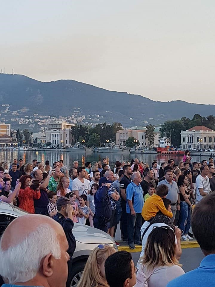Όταν έφτασε η ώρα του εθνικού ύμνου με μια φωνή έψαλαν τον εθνικό ύμνο δημιουργώντας μια πρωτόγνωρη ατμόσφαιρα στην προκυμαία όπου πρόσφυγες, μετανάστες και τουρίστες παρακολουθούσαν ευλαβικά τους Έλληνες να ψάλουν τον εθνικό μας ύμνο.