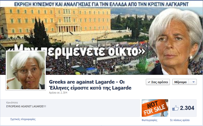Το “κίνημα” κατά της επικεφαλής του ΔΝΤ, Κριστίν Λαγκάρντ, ιδιαίτερα μετά τις ατυχείς δηλώσεις της κατά της Ελλάδας, έχει αρχίσει να “φουντώνει”.Στον κοινωνικό ιστότοπο του Facebook, έχει δημιουργηθεί σελίδα ειδικά αφιερωμένη στην κ.Λαγκάρντ, που φέρει τον τίτλο “Greeks are against Lagarde-Οι Έλληνες είμαστε κατά της Λαγκάρντ” και ήδη έχει συγκεντρώσει 2.304 οπαδούς -και μάλιστα όχι μόνο Έλληνες.Μέσω της σελίδας, οι διαχειριστές κάνουν έκκληση στα μέλη της ομάδας, να προωθήσουν τη σελίδα και στη δική τους χώρα, ενώ τα σχόλια των φίλων της σελίδας είναι από αιχμηρά εώς υβριστικά.Υπενθυμίζουμε ότι η επικεφαλής του ΔΝΤ είχε δηλώσει στον Guardian ότι έχει έρθει η ώρα οι Έλληνες να πληρώσουν τους φόρους τους, σημειώνοντας χαρακτηριστικά: “μην περιμένετε καμία συμπάθεια”, ενώ επισήμανε ότι σκέφτεται περισσότερο τα παιδιά στη Νιγηρία, γιατί χρειάζονται περισσότερη βοήθεια από τους ανθρώπους στην Αθήνα. Μπορείτε να επισκεφθείτε τη σλίδα στη διέυθυνση:http://www.facebook.com/GreeksVSLagarde?ref=tn_tnmn