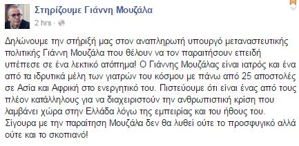 «Δηλώνουμε τη στήριξή μας στον αναπληρωτή υπουργό μεταναστευτικής πολιτικής Γιάννη Μουζάλα που θέλουν να τον παραιτήσουν επειδή υπέπεσε σε ένα λεκτικό ατόπημα! Ο Γιάννης Μουζάλας είναι ιατρός και ένα από τα ιδρυτικά μέλη των γιατρών του κόσμου με πάνω από 25 αποστολές σε Ασία και Αφρική στο ενεργητικό του. Πιστεύουμε ότι είναι ένας από τους πλέον κατάλληλους για να διαχειριστούν την ανθρωπιστική κρίση που λαμβάνει χώρα στην Ελλάδα λόγω της εμπειρίας και του ήθους του. Σίγουρα με την παραίτηση Μουζάλα δεν θα λυθεί ούτε το προσφυγικό αλλά ούτε και το σκοπιανό!»