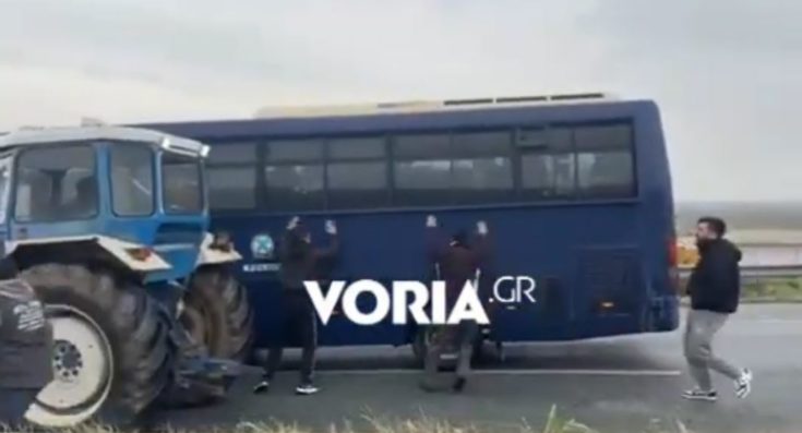 Πατάει γκάζι, κάνει αναστροφή και επιχειρεί να σπάσει το μπλόκο των αγροτών, ο οδηγός κλούβας της αστυνομίας, σε ένα από τα σημεία όπου έχουν βγει οι αγρότες στον δρόμο, στον κόμβο Πετριτσίου στις Σέρρες.