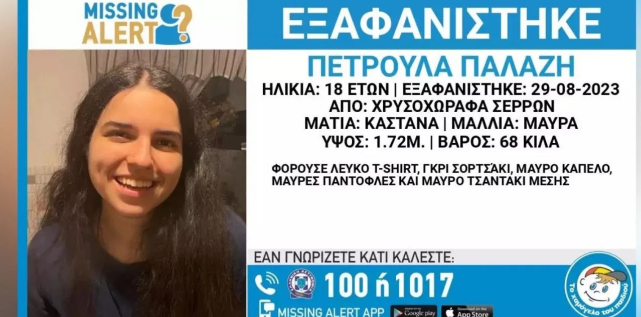 Στις 29 Αυγούστου 2023, μεσημεριανές ώρες, εξαφανίστηκε από την περιοχή Χρυσοχώραφα Σερρών η Παλάζη Πετρούλα, 18 ετών. Το «Χαμόγελο του Παιδιού» ενημερώθηκε για την εξαφάνιση της Παλάζη Πετρούλας σήμερα στις 30 Αυγούστου 2023 και προχώρησε άμεσα, κατόπιν αιτήματος της οικογένειάς της, στη δημοσιοποίηση των στοιχείων της ενήλικης, καθώς ενδέχεται να συντρέχουν λόγοι, οι οποίοι θέτουν τη ζωή της σε κίνδυνο.