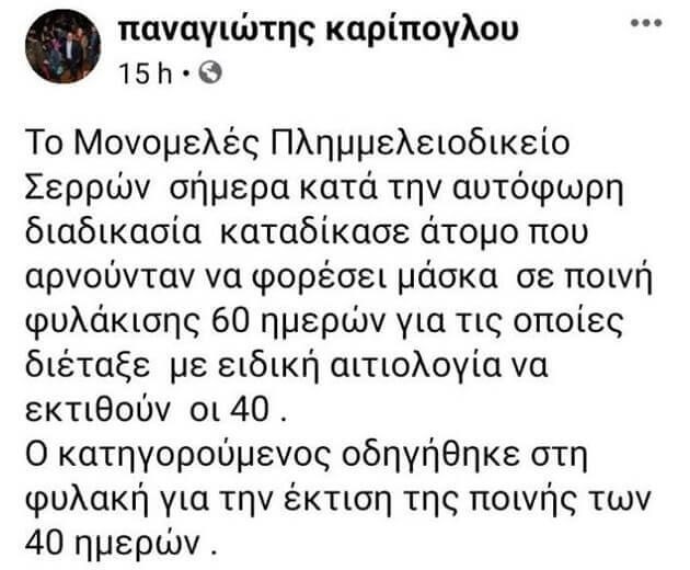 Την υπόθεση ανέδειξε με ανάρτηση του στον προσωπικό του λογαριασμό στα social media ο πρόεδρος του δικηγορικού συλλόγου Σερρών, Παναγιώτης Καρίπογλου.