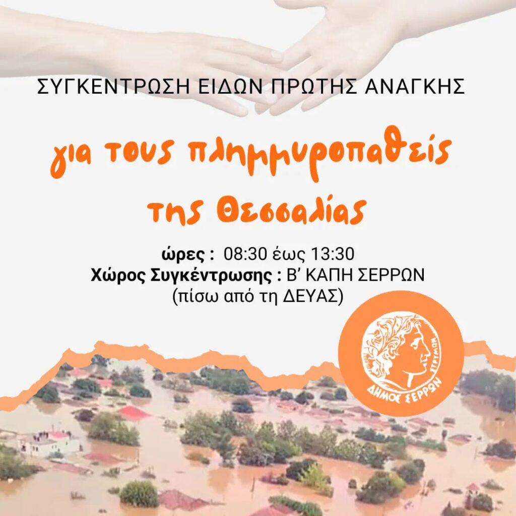 Ο Δήμος Σερρών  απευθύνει κάλεσμα στους δημότες του και προχωρά σε συγκέντρωση βοήθειας για τους πλημμυροπαθείς της Θεσσαλίας.   Η συγκέντρωση ειδών πρώτης ανάγκης θα γίνεται τις καθημερινές ημέρες στο Β’ΚΑΠΗ Σερρών (πίσω από την ΔΕΥΑΣ) από τις 08:30 έως τις 13:30.