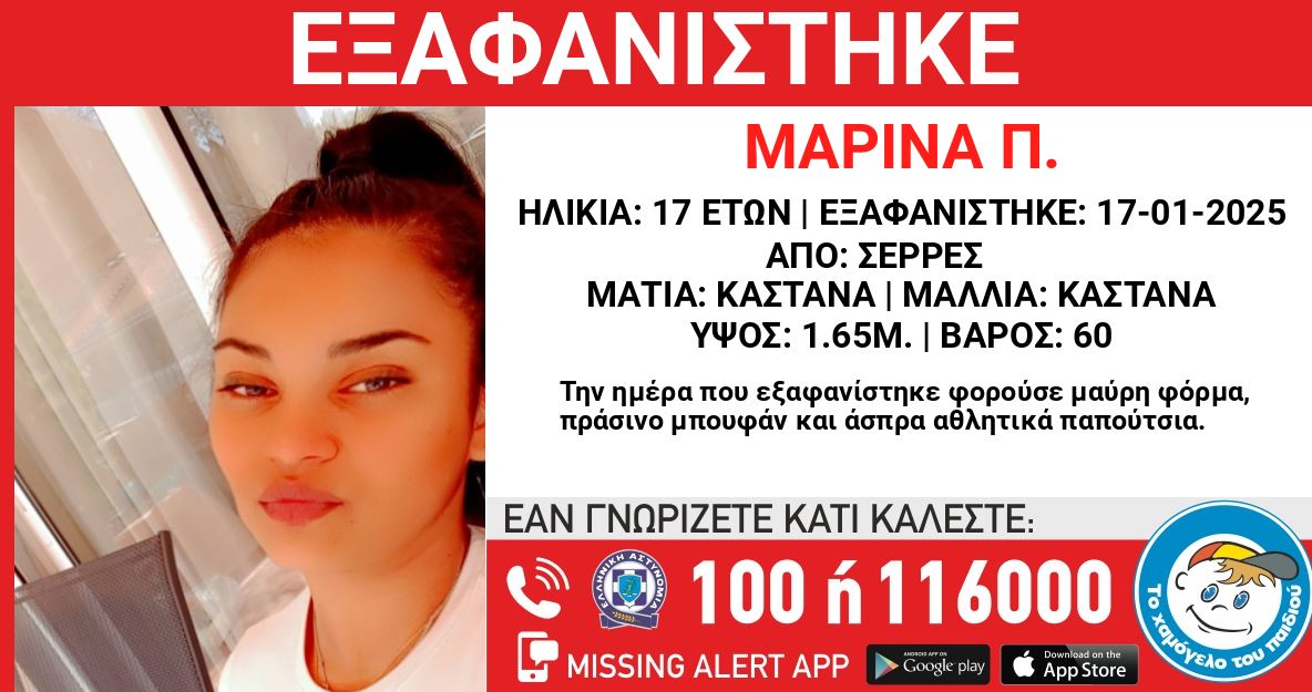 «Στις 17/01/2025, μεσημεριανές ώρες εξαφανίστηκε από την περιοχή των Σερρών η Μαρίνα Π., 17 ετών. Η Μαρίνα Π. έχει καστανά μαλλιά, καστανά μάτια, έχει 1.65 ύψος και είναι 60 κιλά. Την ημέρα που εξαφανίστηκε φορούσε πράσινο μπουφάν, μαύρη φόρμα και άσπρα αθλητικά παπούτσια.