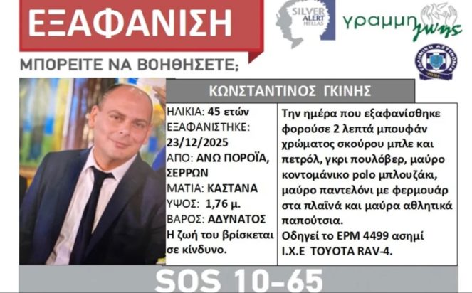 Σύμφωνα με την ΕΡΤ, σε εξέλιξη είναι από το πρωί έρευνες στην περιοχή των Άνω Ποροίων Σερρών για τον εντοπισμό του, καθώς αγνοείται από το πρωί της Τρίτης, όταν έφυγε με το αυτοκίνητο του από το σπίτι και έκτοτε δεν έχει δώσει σημεία ζωής.