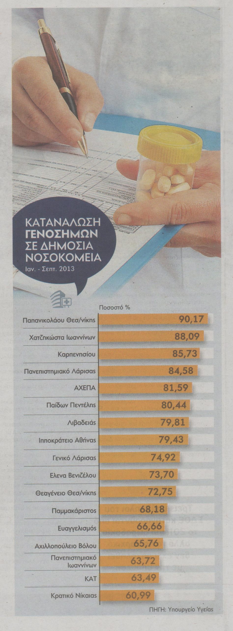 Σύμφωνα με πρόσφατα στοιχεία του υπουργείου, ο μέσος όρος χρήσης γενοσήμων στα νοσοκομεία ξεπερνά το 60% ενώ σε ορισμένα νοσηλευτικά ιδρύματα ξεπερνά και το 90%.