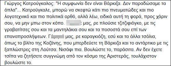 «Γιώργος Kατρούγκαλος: “Η συμφωνία δεν είναι Βάρκιζα. Δεν παραδώσαμε τα όπλα”… Κατρούγκαλε, μπορώ να σκεφτώ κάτι πιο πνευματώδες και πιο λογοτεχνικό και πιο πολιτικά ορθό, αλλά λέω, ειδικά αυτή τη φορά, προς χάριν σου, να μην μπω στον κόπο. Γ@@@@@ μας, ρε πλούσιε τζιτζιφιόγκο, με τις γραβατίτσες σου και τα μαντηλάκια σου και τα ποσοστά σου επί των επαναπροσλήψεων. Γ@@@@@ μας, ρε καραγκιόζη, εσύ και τα άλλα τσόλια, όπως το βλίτο της Κοζάνης, που μπερδεύετε τη Βάρκιζα και το αντάρτικο με τις ξαπλώστρες στη Λούτσα. Νισάφι πια. Βουλώστε το, παράσιτα. Αν δεν έχετε τσίπα να ζητήσετε συγγνώμη από τον κόσμο της Αριστεράς, τουλάχιστον βουλώστε το».