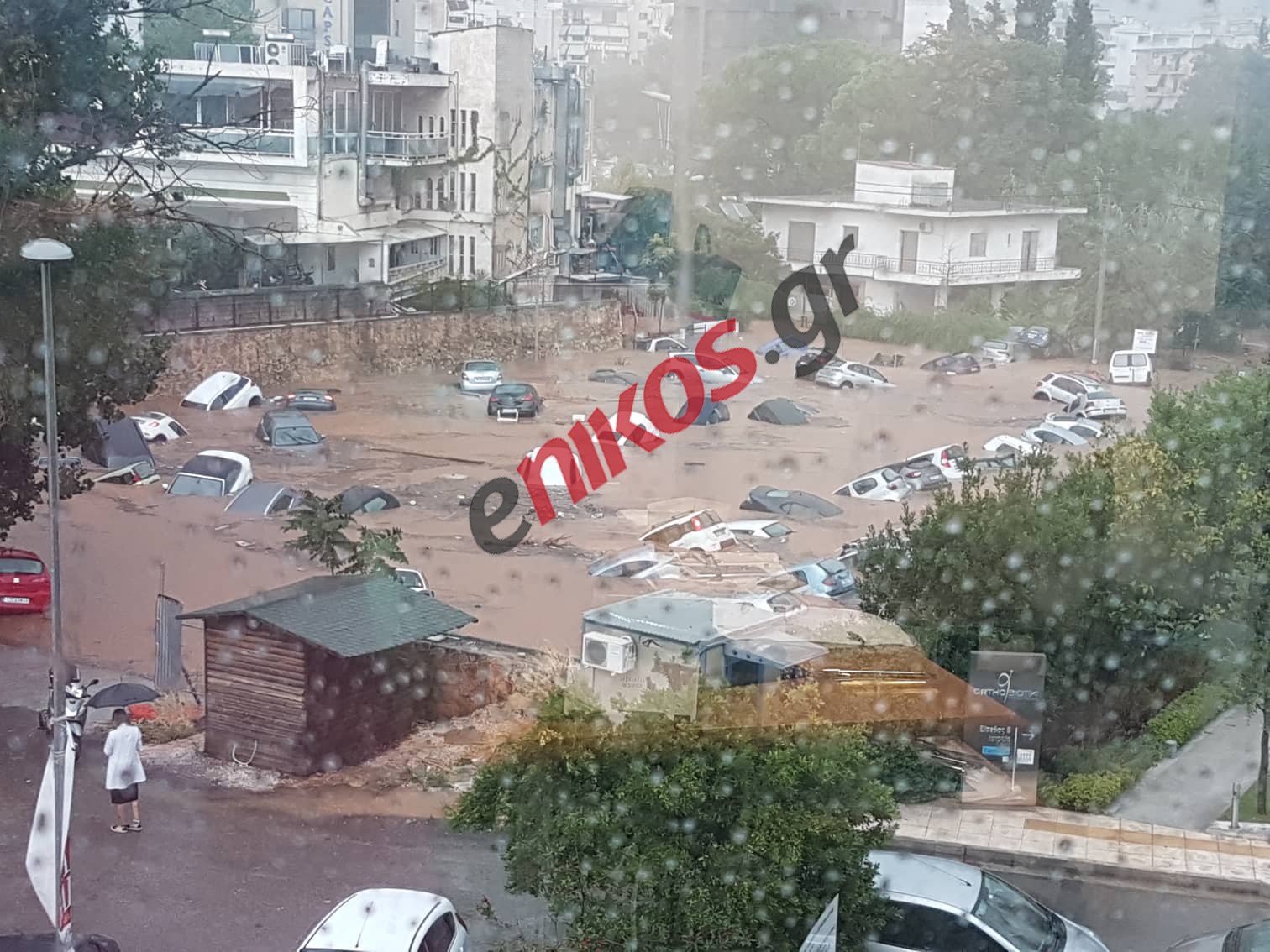 Σοκ προκαλούν οι εικόνες από το υπαίθριο πάρκινγκ στο Μαρούσι, όπου σε μόλις λίγα λεπτά τα αυτοκίνητα “πνίγηκαν” στα ορμητικά νερά της βροχής.