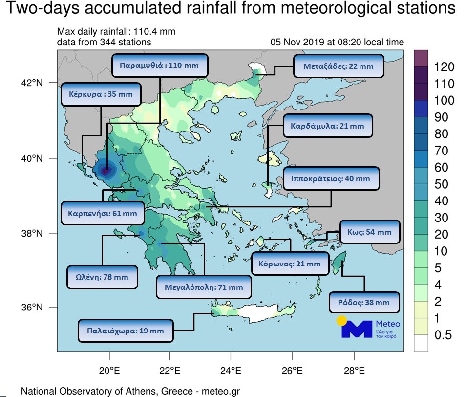 Στον χάρτη που δημοσίευσε το meteo.gr αποτυπώνονται τα αθροιστικά ύψη βροχόπτωσης όπως αυτά καταγράφηκαν από 344 μετεωρολογικούς σταθμούς του δικτύου αυτόματων μετεωρολογικών σταθμών του Εθνικού Αστεροσκοπείου Αθηνών / meteo.gr και τα μεγαλύτερα ύψη βροχόπτωσης ανά γεωγραφικό διαμέρισμα.