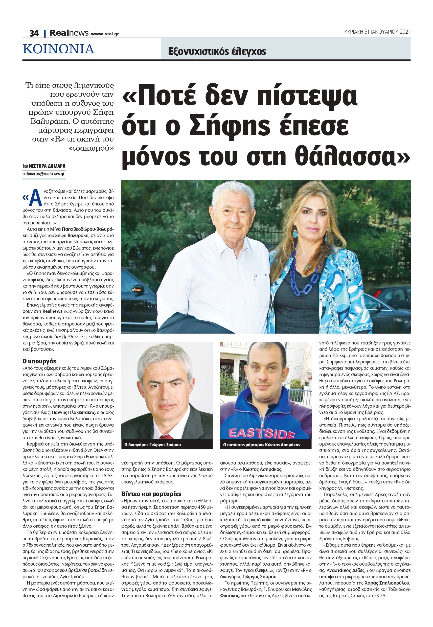 «Ημουν στην ακτή, είχε ησυχία και η θάλασσα ήταν ήρεμη. Σε απόσταση περίπου 450 μέτρων, είδα το σκάφος του Βαλυράκη απέναντι από την Αγία Τριάδα. Του έσβησε μια-δυο φορές, αλλά το ξεκίνησε πάλι. Βρέθηκε σε ένα σημείο όταν τον πλησίασε ένα άσπρο αλιευτικό σκάφος, δεν ήταν μεγαλύτερο από 7-8 μέτρα. Λογομάχησαν. “Δεν ξέρεις ότι απαγορεύεται; Τι κάνεις εδώ;», του είπε ο καπετάνιος. «Κι εσένα τι σε νοιάζει;», του απάντησε ο Βαλυράκης. “Εμένα τι με νοιάζει; Εγώ είμαι επαγγελματίας. Θα πάρω το Λιμενικό”. Τότε ακολούθησαν βρισιές. Μετά το αλιευτικό έκανε τρεις στροφές γύρω από το φουσκωτό, προκαλώντας μεγάλο κυματισμό. Στη συνέχεια έφυγε. Την πτώση Βαλυράκη δεν την είδα, αλλά τα άκουσα όλα καθαρά, είχε ησυχία», αναφέρει στην «R» ο Κώστας Ασημάκος. Στελέχη του Λιμενικού χαρακτήρισαν ως πολύ σημαντική τη συγκεκριμένη μαρτυρία, αλλά δεν παρέλειψαν να εντοπίσουν και ορισμένες ασάφειες και αοριστίες στα λεγόμενα του μάρτυρα. «Η συγκεκριμένη μαρτυρία για την εμπλοκή μεγαλύτερου αλιευτικού σκάφους είναι αποκαλυπτική. Το μικρό καΐκι έκανε έντονες περιστροφές γύρω από το μικρό φουσκωτό. Εκδήλωσε εγκληματική επιθετική συμπεριφορά. Ο Σήφης καθόταν στο μπαλόνι, γιατί το μικρό φουσκωτό δεν έχει κάθισμα. Είναι αδύνατο να έχει χτυπηθεί από τη δική του προπέλα. Προφανώς ο καπετάνιος τον είδε ότι έπεσε και τον χτύπησε, αλλά, παρ’ όλα αυτά, σηκώθηκε και έφυγε. Τον εγκατέλειψε…», τονίζει στην «R» ο δικηγόρος Γιώργος Σπύρου.