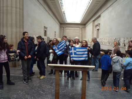 15χρονοι μαθητές σήκωσαν ελληνικές σημαίες μπροστά στα ελγίνεια Μάρμαρα Ζήτησαν την επιστροφή των αρχαιοτήτων στην Αθήνα.
