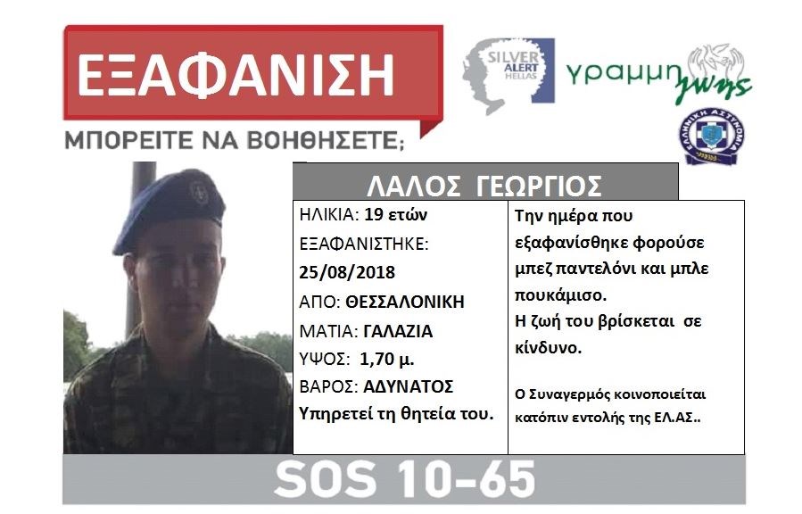Την εξαφάνιση ενός 19χρονου φαντάρου από τη Θεσσαλονίκη γνωστοποίησε τα μεσάνυχτα της Δευτέρας η Γραμμή Ζωής.Όπως αναφέρει στη σχετική ανακοίνωση η Γραμμή Ζωής ο Γιώργος Λάλος αγνοείται από τις 25 Αυγούστου.