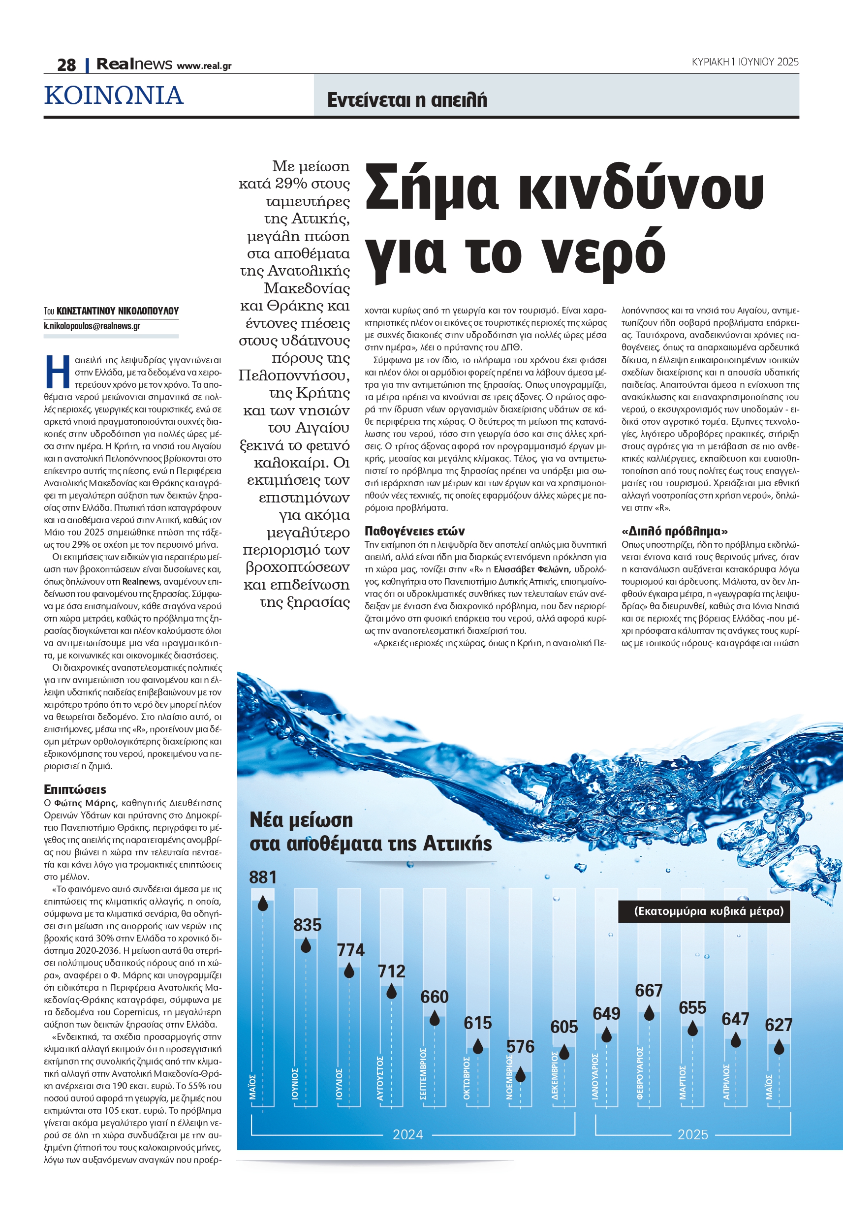 Πτωτική τάση καταγράφουν και τα αποθέματα νερού στην Αττική, καθώς τον Μάιο του 2025 σημειώθηκε πτώση της τάξεως του 29% σε σχέση με τον περυσινό μήνα. Οι εκτιμήσεις των ειδικών για περαιτέρω μείωση των βροχοπτώσεων είναι δυσοίωνες και, όπως δηλώνουν στη Realnews, αναμένουν επιδείνωση του φαινομένου της ξηρασίας. Σύμφωνα με όσα επισημαίνουν, κάθε σταγόνα νερού στη χώρα μετράει, καθώς το πρόβλημα της ξηρασίας διογκώνεται και πλέον καλούμαστε όλοι να αντιμετωπίσουμε μια νέα πραγματικότητα, με κοινωνικές και οικονομικές διαστάσεις.