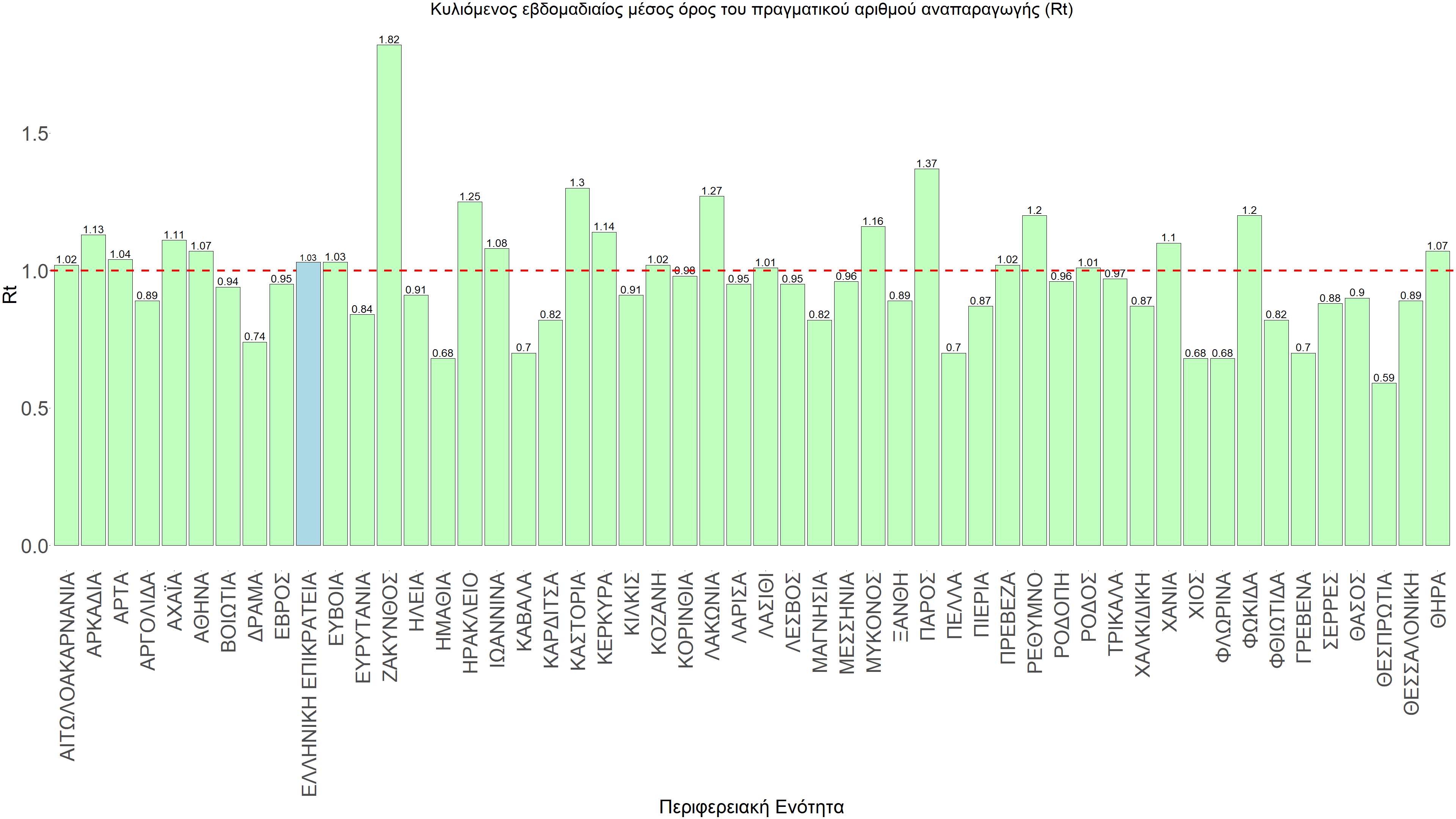 O πραγματικός αριθμός αναπαραγωγής Rt ανά περιφερειακή ενότητα της χώρας παρουσιάζεται στο Σχήμα 58.
