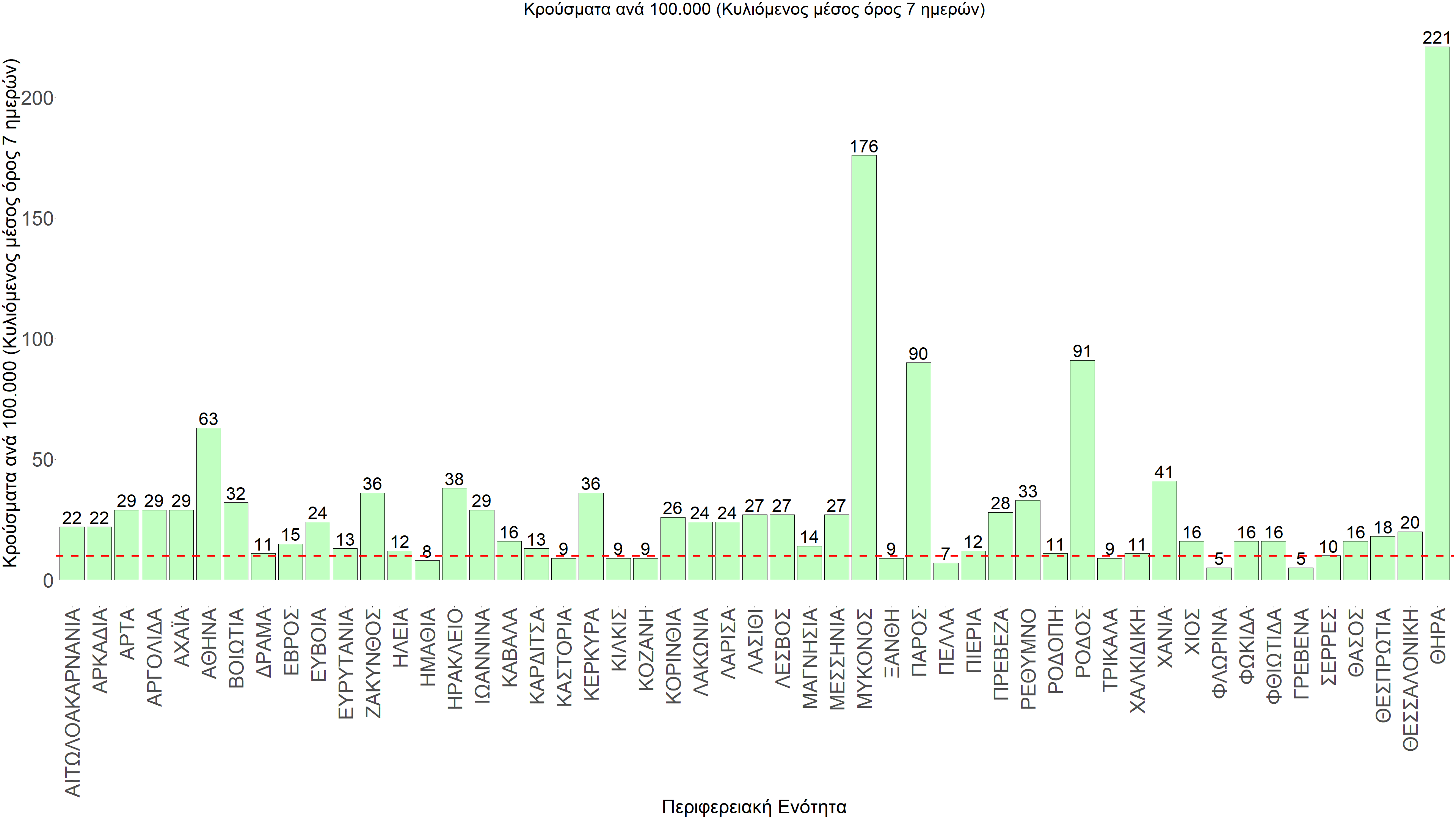 Σχήμα 60. Συγκεντρωτική εικόνα των νέων κρουσμάτων ανά 100.000 κατοίκους (κυλιόμενος μέσος όρος 7 ημερών) των επιμέρους περιοχών