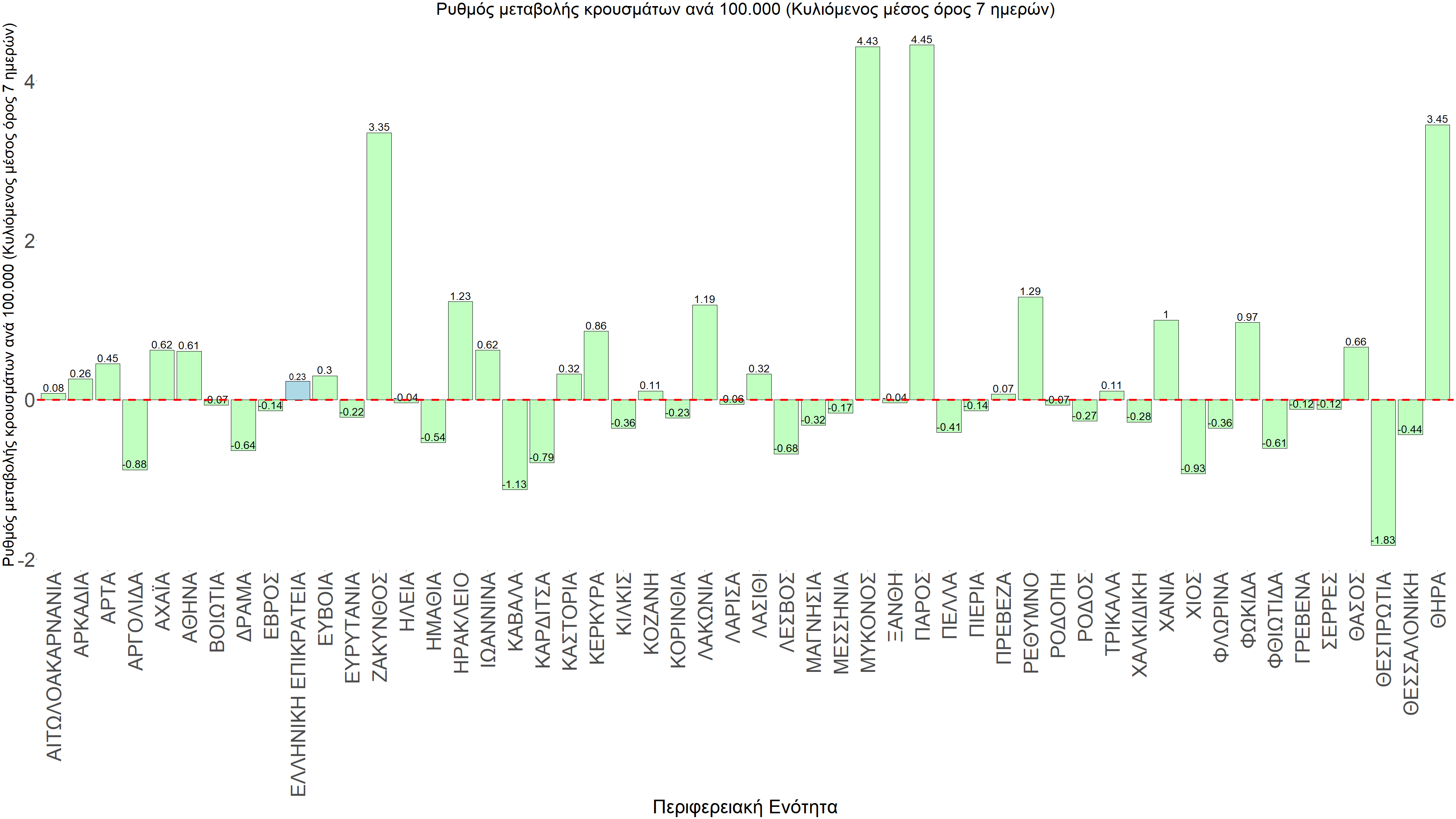 Η αποτύπωση των τάσεων στις επιμέρους περιοχές, παρουσιάζεται στο Σχήμα 61, όπου παρουσιάζεται ο ρυθμός μεταβολής των νέων κρουσμάτων ανά 100.000 κατοίκους (κυλιόμενος μέσος όρος 7 ημερών) των επιμέρους περιοχών. Θετικές τιμές του ρυθμού μεταβολής υποδηλώνουν άνοδο, ενώ αρνητικές τιμές υποδηλώνουν πτωτική πορεία.
