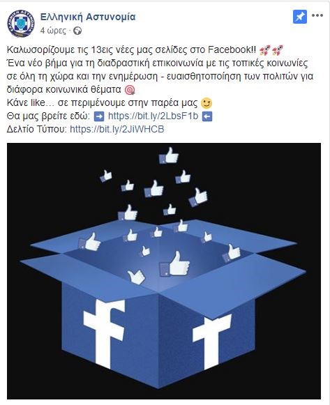 Δεκατρείς νέες σελίδες στο Facebook απέκτησε πρόσφατα η Ελληνική Αστυνομία, επεκτείνοντας έτσι την παρουσία της στα μέσα κοινωνικής δικτύωσης, καθώς η πρώτη επίσημη σελίδα της, που δημοσιεύτηκε τον Σεπτέμβριο του 2016, έχει εξελιχθεί σε μία απο τις ταχύτερα αναπτυσσόμενες στη Ελλάδα (Fastest-Growing Society Pages in Greece), με 93.000 ακόλουθους-χρήστες, μέχρι στιγμής.