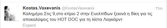 Με ιδιαίτερο ενδιαφέρον αναμένεται να ξεκινήσει σήμερα η δίκη του δημοσιογράφου Κώστα Βαξεβάνη, για τη δημοσιοποίηση της λίστας Λαγκάρντ από το περιοδικό του HOT DOC.
