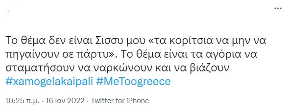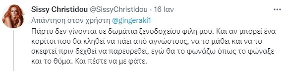«Tα πάρτι δεν γίνονται σε δωμάτια ξενοδοχείου. Κι αν μπορεί ένα κορίτσι να κληθεί να πάει από αγνώστους, να το μάθει και να τι σκεφτεί πριν δεχθεί να παρευρεθεί. Εγώ θα το φωνάζω, όπως το φώναξε το θύμα. Και πέστε να με φάτε», έγραψε αρχικά η Σίσσυ Χρηστίδου και προκάλεσε θύελλα αντιδράσεων