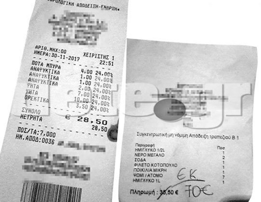 Και ενώ πλήρωσαν και ήταν έτοιμοι να φύγουν, ο καταστηματάρχης τους δηλώνει πως έπρεπε να πληρώσουν… 70 ευρώ αφού το κατάστημά του έχει… ελάχιστη κατανάλωση! Μάλιστα έγραψε με το χέρι του στο δελτίο παραγγελίας «Ε.Κ. 70 ευρώ» αγνοώντας φυσικά τη νόμιμη απόδειξη.