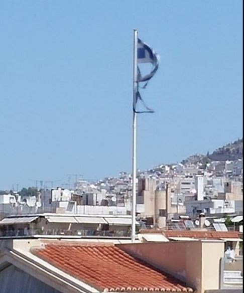 Τη φωτογραφία ανέβασε στο twitter ο χρήστης Ger_Kavvadas γράφοντας: “Η ελληνική σημαία σήμερα στο ΕΜΠ, είναι σε άθλια κατάσταση όλο το καλοκαίρι και την καμαρώνουμε καθημερινά”.