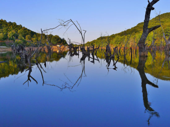 Μέσα στον ταμιευτήρα υπάρχουν κορμοί καμένων και ξερών δέντρων που «στέκουν» όρθια τα πιο πολλά και δημιουργούν με το νερό ωραίες αντανακλάσεις. Το θέαμα είναι μαγικό αλλά και κάπως απόκοσμο… Δεν υπάρχει καθόλου ζωή στο νερό και επικρατεί απόλυτη ησυχία.