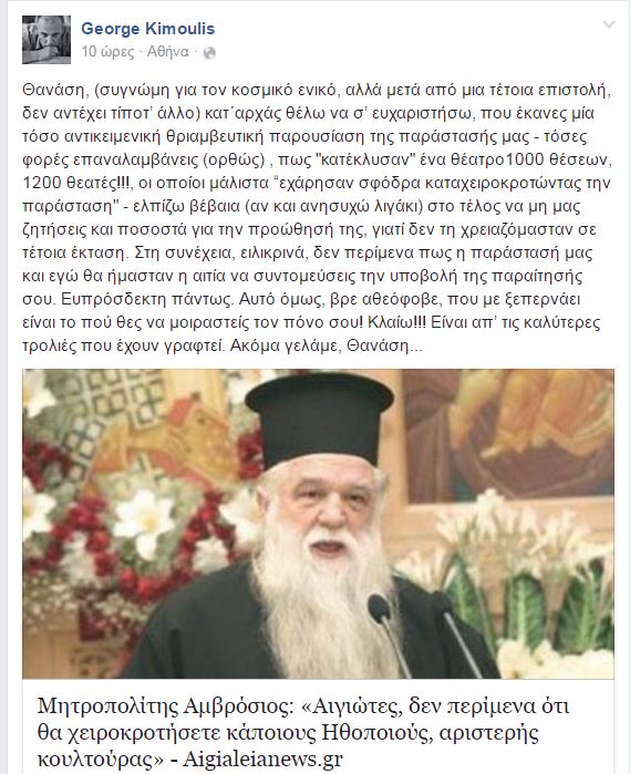 «Θανάση, (συγγνώμη για τον κοσμικό ενικό, αλλά μετά από μια τέτοια επιστολή, δεν αντέχει τίποτ’ άλλο) κατ΄αρχάς θέλω να σ’ ευχαριστήσω, που έκανες μία τόσο αντικειμενική θριαμβευτική παρουσίαση της παράστασής μας – τόσες φορές επαναλαμβάνεις (ορθώς) , πως «κατέκλυσαν» ένα θέατρο 1000 θέσεων, 1200 θεατές!!!, οι οποίοι μάλιστα “εχάρησαν σφόδρα καταχειροκροτώντας την παράσταση» – ελπίζω βέβαια (αν και ανησυχώ λιγάκι) στο τέλος να μη μας ζητήσεις και ποσοστά για την προώθησή της, γιατί δεν τη χρειαζόμασταν σε τέτοια έκταση. Στη συνέχεια, ειλικρινά, δεν περίμενα πως η παράστασή μας και εγώ θα ήμασταν η αιτία να συντομεύσεις την υποβολή της παραίτησής σου. Ευπρόσδεκτη πάντως. Αυτό όμως, βρε αθεόφοβε, που με ξεπερνάει είναι το πού θες να μοιραστείς τον πόνο σου! Κλαίω!!! Είναι απ’ τις καλύτερες τρολιές που έχουν γραφτεί. Ακόμα γελάμε, Θανάση…» σημείωσε ο ηθοποιός στο προφίλ του.