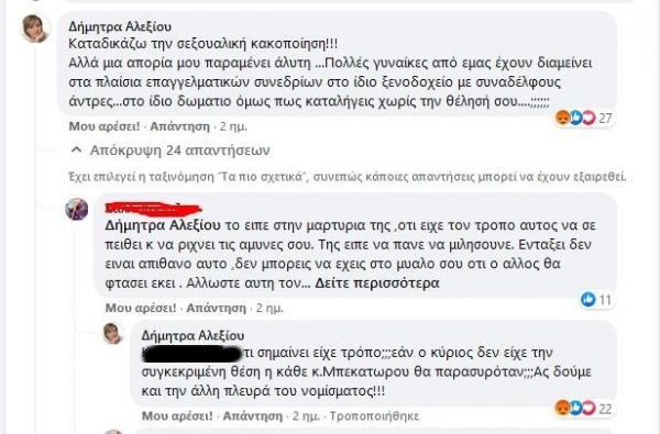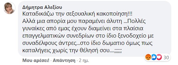 Σε αυτό το μήκος κύματος κινήθηκε και η κ. Αλεξίου, η οποία με δημόσιο σχόλιό της σε μέσο κοινωνικής δικτύωσης αναρωτήθηκε πώς γίνεται γυναίκες που σε επαγγελματικά συνέδρια διαμένουν στο ίδιο ξενοδοχείο με άνδρες συναδέλφους, να καταλήγουν στο ίδιο δωμάτιο χωρίς τη θέλησή τους. Μάλιστα στη συνέχεια υπεραμύνθηκε της στάσης της φτάνοντας να γράψει ότι την ενοχλεί «αφάνταστα που μέρος των γυναικών τους βολεύει αποποιούμενες κάθε ευθύνη τους να επιρρίπτουν βιασμούς και πολλά άλλα για να ανέβουν επαγγελματικά» (τα σχετικά στιγμιότυπα οθόνης είναι στη διάθεσή μας! Να εξηγήσουμε λοιπόν στην κ. Αλεξίου και σε ανάλογους καλοθελητές, πως όταν μια γυναίκα βρίσκεται στο ίδιο δωμάτιο με έναν άντρα δεν είναι απαραίτητο να επιδιώκει σεξουαλική επαφή μαζί του και πως το «όχι» -που γιορτάζεται και ως εθνική επέτειος- σημαίνει όχι.