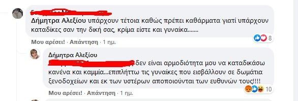 Σε αυτό το μήκος κύματος κινήθηκε και η κ. Αλεξίου, η οποία με δημόσιο σχόλιό της σε μέσο κοινωνικής δικτύωσης αναρωτήθηκε πώς γίνεται γυναίκες που σε επαγγελματικά συνέδρια διαμένουν στο ίδιο ξενοδοχείο με άνδρες συναδέλφους, να καταλήγουν στο ίδιο δωμάτιο χωρίς τη θέλησή τους. Μάλιστα στη συνέχεια υπεραμύνθηκε της στάσης της φτάνοντας να γράψει ότι την ενοχλεί «αφάνταστα που μέρος των γυναικών τους βολεύει αποποιούμενες κάθε ευθύνη τους να επιρρίπτουν βιασμούς και πολλά άλλα για να ανέβουν επαγγελματικά» (τα σχετικά στιγμιότυπα οθόνης είναι στη διάθεσή μας! Να εξηγήσουμε λοιπόν στην κ. Αλεξίου και σε ανάλογους καλοθελητές, πως όταν μια γυναίκα βρίσκεται στο ίδιο δωμάτιο με έναν άντρα δεν είναι απαραίτητο να επιδιώκει σεξουαλική επαφή μαζί του και πως το «όχι» -που γιορτάζεται και ως εθνική επέτειος- σημαίνει όχι.
