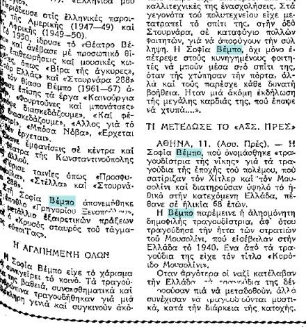 Τη βραδιά του Πολυτεχνείου η Βέμπο ανοίγει το σπίτι της και κρύβει φοιτητές τους οποίους αρνείται να παραδώσει όταν η ασφάλεια χτυπά την πόρτα της. Η εμφάνισή της στην εκδήλωση που πραγματοποιήθηκε στο Καλλιμάρμαρο για την επάνοδο της Δημοκρατίας, τραγουδώντας:/ Παιδιά της Ελλάδος παιδιά και τα τανκς γονάτισαν κείνη τη βραδιά…, ήρθε να απαλύνει τις θλιβερές εντυπώσεις από την παρουσία της πάνω στα κακόγουστα άρματα στις φιέστες των συνταγματαρχών λίγα χρόνια πριν στον ίδιο χώρο.