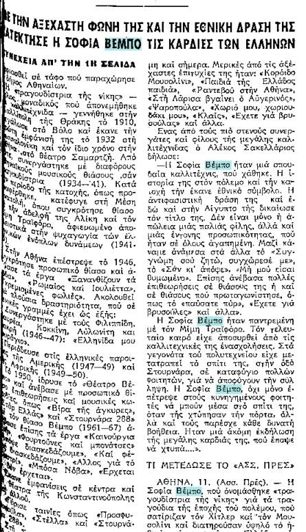 Κορυφαία ερμηνεύτρια και ηθοποιός που γεννήθηκε στις 10 Φεβρουαρίου 1910. Η καλλιτεχνική της πορεία εκτείνεται από τον Μεσοπόλεμο έως τα πρώτα μεταπολεμικά χρόνια και τη δεκαετία του ’50. Χαρακτηρίστηκε «τραγουδίστρια της νίκης» εξαιτίας των εθνικών τραγουδιών που ερμήνευσε κατά τη διάρκεια του Ελληνοϊταλικού πολέμου του 1940. Το όνομα Βέμπο επέλεξε η ίδια να υιοθετήσει κάνοντας και τις απαραίτητες νόμιμες διαδικασίες επειδή έτσι εσφαλμένα είχε συνηθίσει να προφέρει το όνομά της το κοινό, καθώς το πραγματικό της όνομα ήταν Σοφία Μπέμπου.