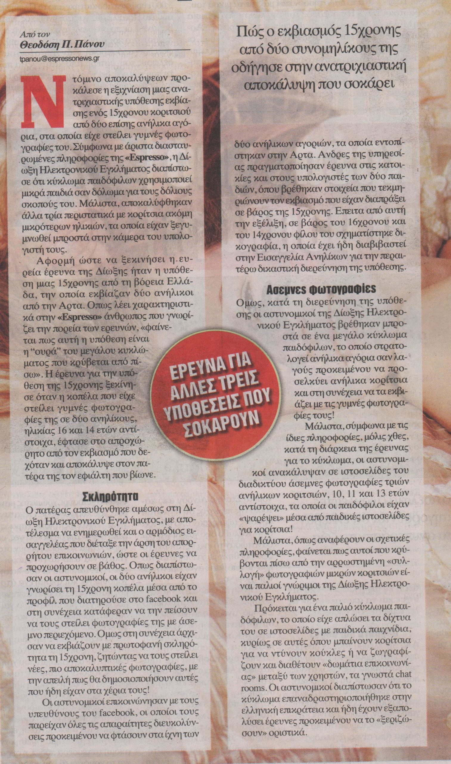 Αφορμή ώστε να ξεκινήσει η ευρεία έρευνα της Δίωξης ήταν η υπόθεση μιας δεκαπεντάχρονης από τη βόρεια Ελλάδα, την οποία εκβίαζαν δύο ανήλικοι από την Άρτα. «Φαίνεται πως αυτή η υπόθεση είναι ουρά του μεγάλου κυκλώματος που κρύβεται από πίσω», σημείωσε στην Espresso άνθρωπος που γνωρίζει την πορεία των ερευνών.