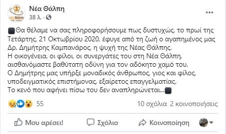 Την τραγική είδηση επιβεβαίωσε με ανάρτηση στον λογαριασμό της στο facebook η Μονάδα Φροντίδας Ηλικιωμένων και Αποκατάστασης, «Νέα Θάλπη» . «Θα θέλαμε να σας πληροφορήσουμε πως δυστυχώς, το πρωί της Τετάρτης, 21 Οκτωβρίου 2020, έφυγε από τη ζωή ο αγαπημένος μας Δρ. Δημήτρης Καμπανάρος, η ψυχή της Νέας Θάλπης. Η οικογένεια, οι φίλοι, οι συνεργάτες του στη Νέα Θάλπη, αισθανόμαστε βαθύτατη οδύνη για τον αδόκητο χαμό του. Ο Δημήτρης μας υπήρξε μοναδικός άνθρωπος, γιος και φίλος, υποδειγματικός επιστήμονας, εξαίρετος επαγγελματίας. Tο κενό που αφήνει πίσω του δεν αναπληρώνεται…», αναφέρεται στην ανάρτηση.