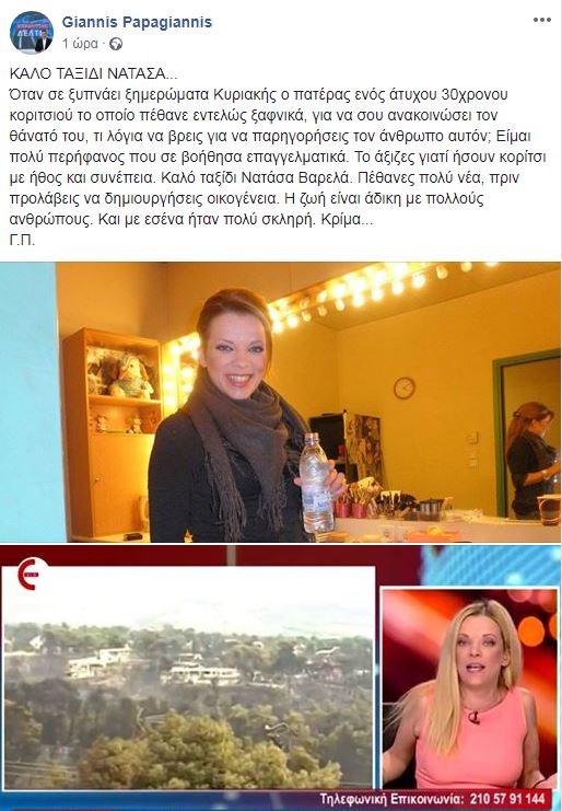 Σοκ στον δημοσιογραφικό κόσμο έχει προκαλέσει η είδηση του ξαφνικού θανάτου της δημοσιογράφου και παρουσιάστριας Νατάσσας Βαρελά, σε ηλικία μόλις 30 ετών.