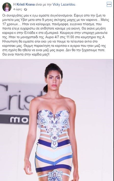 Με ανάρτησή της στο facebook η μάνατζερ μοντέλων Κρίστη Κρανά ανακοίνωσε τον θάνατο της 17χρονης Υβέτ, έπειτα από σκληρή μάχη με τον καρκίνο. Η είδηση του θανάτου της προκάλεσε σοκ και θλίψη στον κόσμο της μόδας.