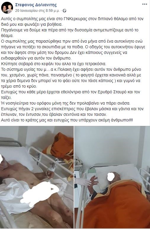 Μάλιστα όπως έγραψε ο χρήστης που ανέβασε τη φωτογραφία στη σελίδα “Τα Παράπονά σου στον Δήμαρχο”, ο ασθενής αφέθηκε χωρίς φροντίδα και καθαριότητα από το νοσηλευτικό προσωπικό και τελικά προσφέρθηκαν να τον βοηθήσουν δύο γυναίκες, επισκέπτριες στο Νοσοκομείο και μια εθελόντρια του Ερυθρού Σταυρού. Όπως ήταν λογικό, η συγκεκριμένη ανάρτηση προκάλεσε αντιδράσεις και αρνητικά σχόλια.
